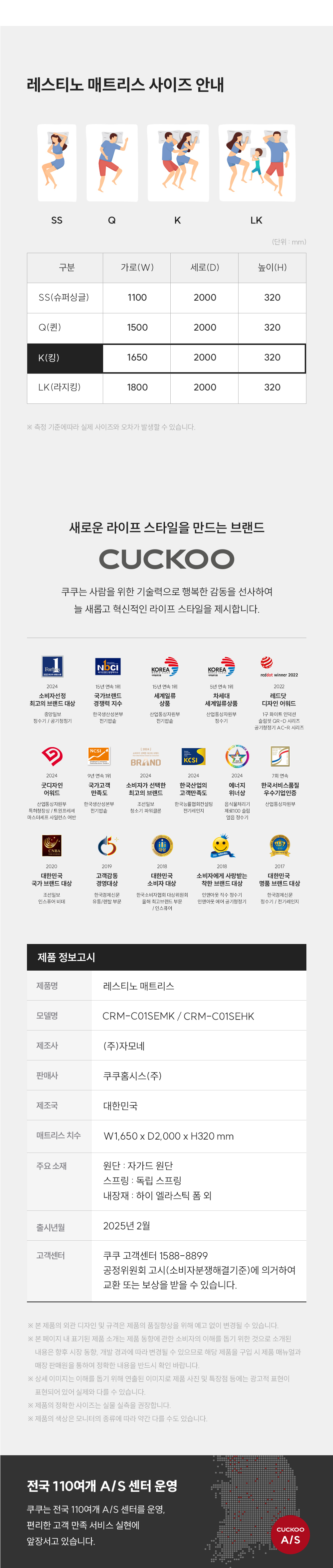 쿠쿠 CRM-C01SE 레스티노 킹 매트리스 렌탈 CRM-C01SE 6년약정: 월24,900원 5년약정: 월26,900원 제품크기 : 1,650 x 2,000 x 320 mm 주요기능 : 킹, 자가드원단, 미디엄경도, 하드경도, 매트리스케어, 독립스프링 설치형태 : 옵션: 미디엄MK /하드HK 방문주기 : - 의무사용기간 : 6년 소유권 이전기간 : 6년 등록설치비 : 면제 렌탈요금 : 월 24,900원 제휴카드 : 월 11,900원 온라인 렌탈문의 네이버 톡톡 이전글 다음글 목록 상품특징 본문 이전글 다음글 목록