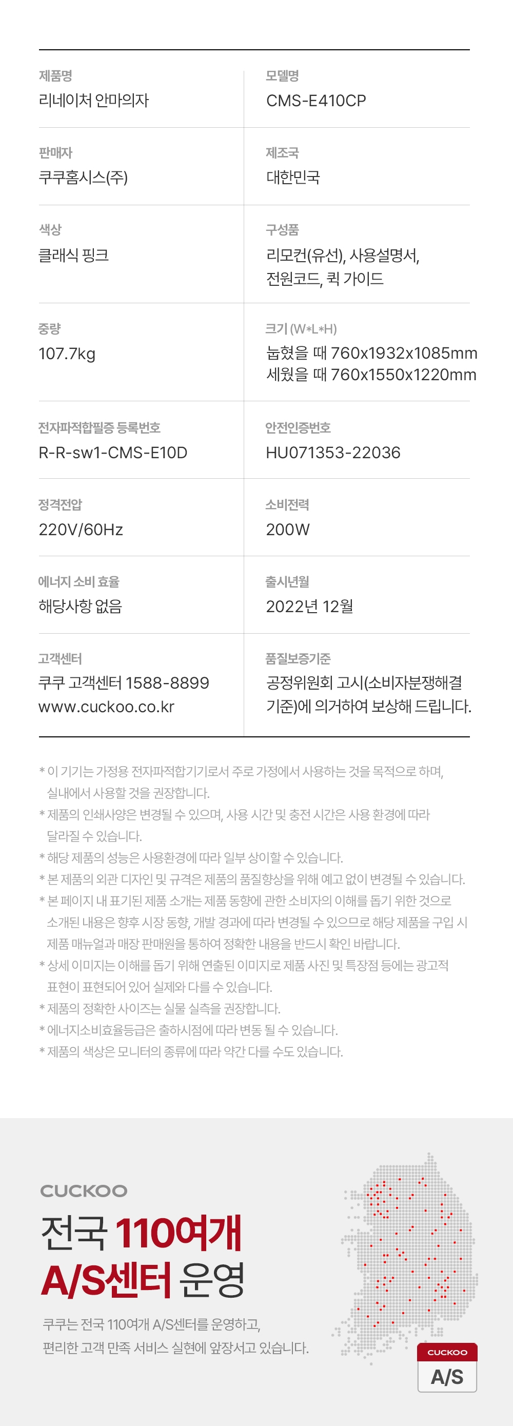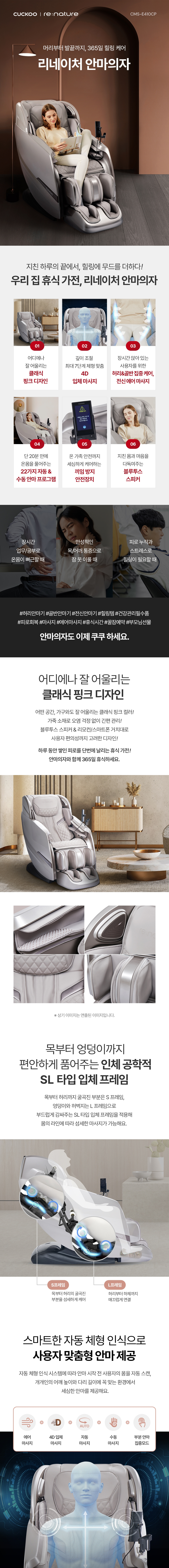 쿠쿠 CMS-E410CP 리네이처 안마의자렌탈 CMS-E410CP 클래식핑크 6년약정: 월71,900원 5년약정: 월82,900원 4년약정: 월99,900원 제품크기 : 760 x 1,932(1,550) x 1,085(1,220) mm 주요기능 : 4D, 리모컨, 무중력, 에어백, 블루투스, 온열 방문주기 : 12개월관리 의무사용기간 : 6년 소유권 이전기간 : 6년 등록설치비 : 면제 렌탈요금 : 월 71,900원 제휴카드 : 월 58,900원 온라인 렌탈문의 네이버 톡톡 이전글 다음글 목록 상품특징 본문 이전글 다음글 목록