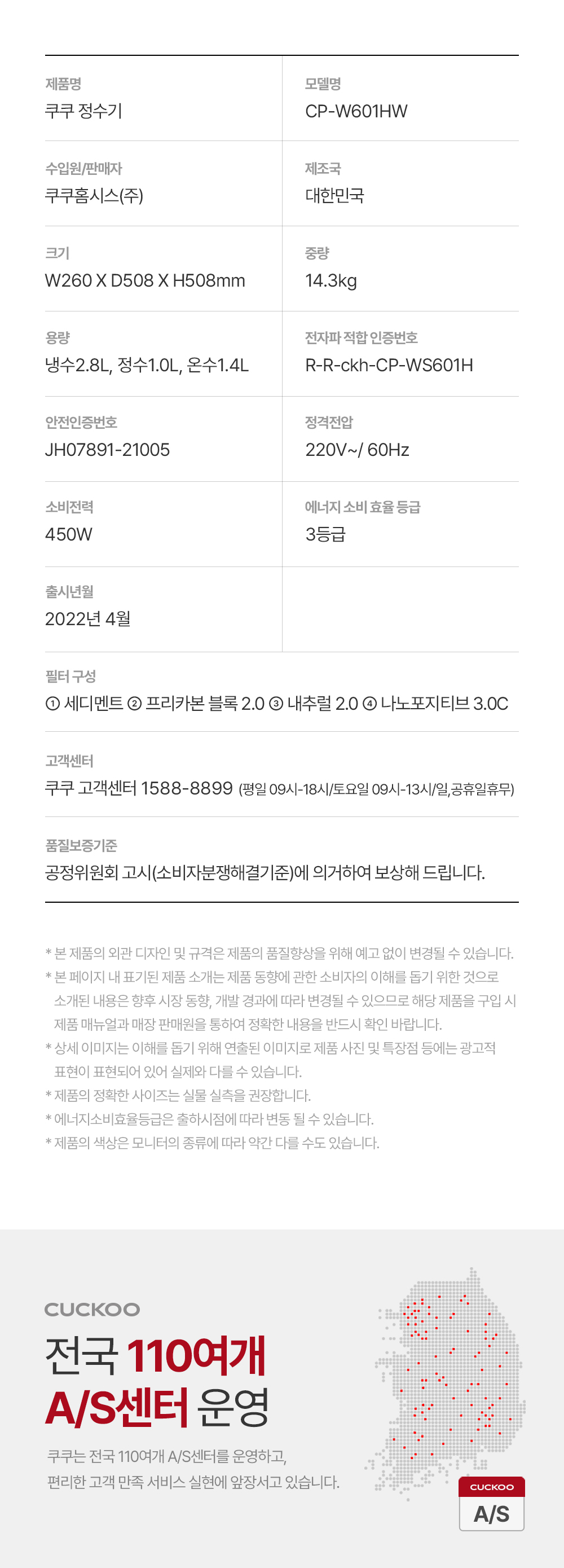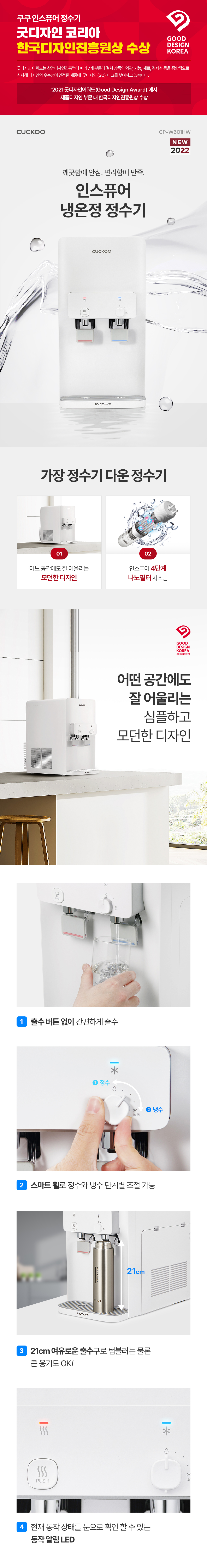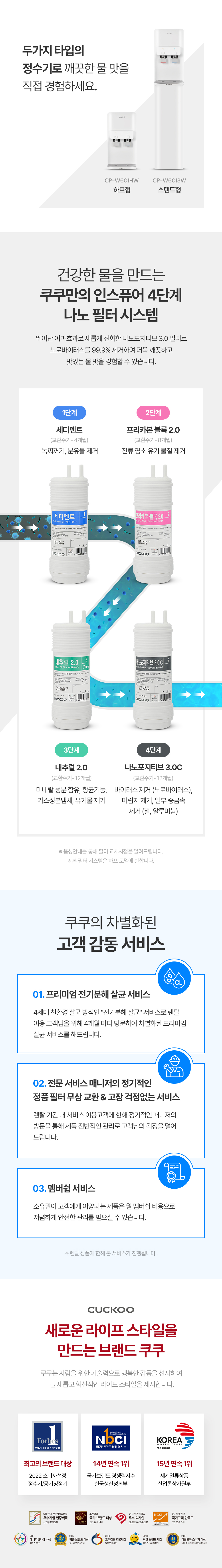 쿠쿠 CP-W601HW 인스퓨어 정수기렌탈 CP-W601HW 화이트 5년약정: 월20,900원 4년약정: 월22,900원 3년약정: 월24,900원 제품크기 : 260 x 508 x 508 mm 제품용량 : 냉수 2.8L 정수 1.0L 온수 1.4L 필터구성 : 나노필터 주요기능 : 냉수, 온수, 정수, 방문관리, 조리수 설치형태 : 카운터 방문주기 : 4개월 의무사용기간 : 5년 소유권 이전기간 : 5년 등록설치비 : 면제 렌탈요금 : 월 20,900원 제휴카드 : 월 7,900원 온라인 렌탈문의 네이버 톡톡 이전글 다음글 목록 상품특징 본문 이전글 다음글 목록