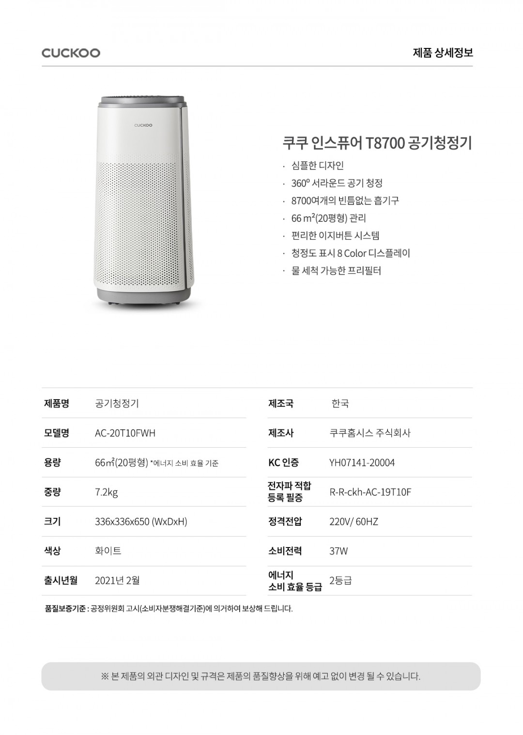 | 쿠쿠 AC-20T10FWH 인스퓨어 T8700 공기청정기렌탈 |