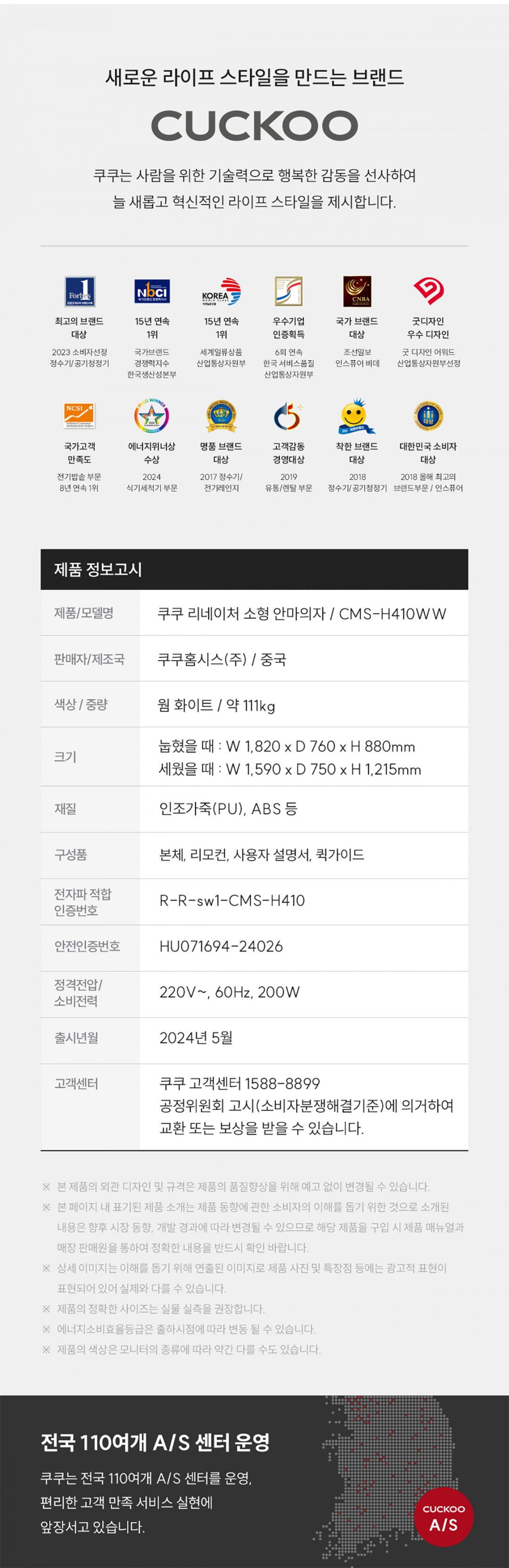 쿠쿠 CMS-H410WW 리네이처 소형 안마의자렌탈 CMS-H410WW 웜베이지 6년약정: 월54,900원 5년약정: 월64,900원 39개월약정: 월84,900원 제품크기 : 1,590 x 750 x 1,215 mm 주요기능 : 4D, 리모컨, 무중력, 에어백, 블루투스, 온열, 리클라이너 방문주기 : 12개월관리 의무사용기간 : 6년 소유권 이전기간 : 6년 등록설치비 : 면제 렌탈요금 : 월 54,900원 제휴카드 : 월 41,900원 온라인 렌탈문의 네이버 톡톡 이전글 다음글 목록 상품특징 본문 이전글 다음글 목록