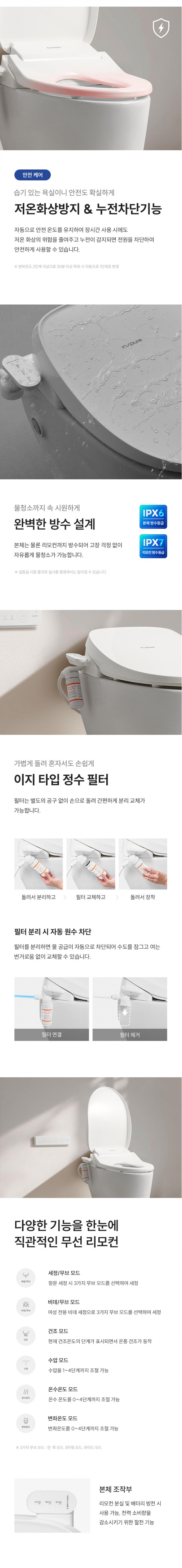 제품크기 : 475 x 538 x 150 mm 주요기능 : 무브세정, 방수, 건조, 온열, 리모컨 방문주기 : (셀프관리) : 4개월필터발송,12개월방문 (방문관리) : 4개월 의무사용기간 : 5년 소유권 이전기간 : 5년 등록설치비 : 면제 |